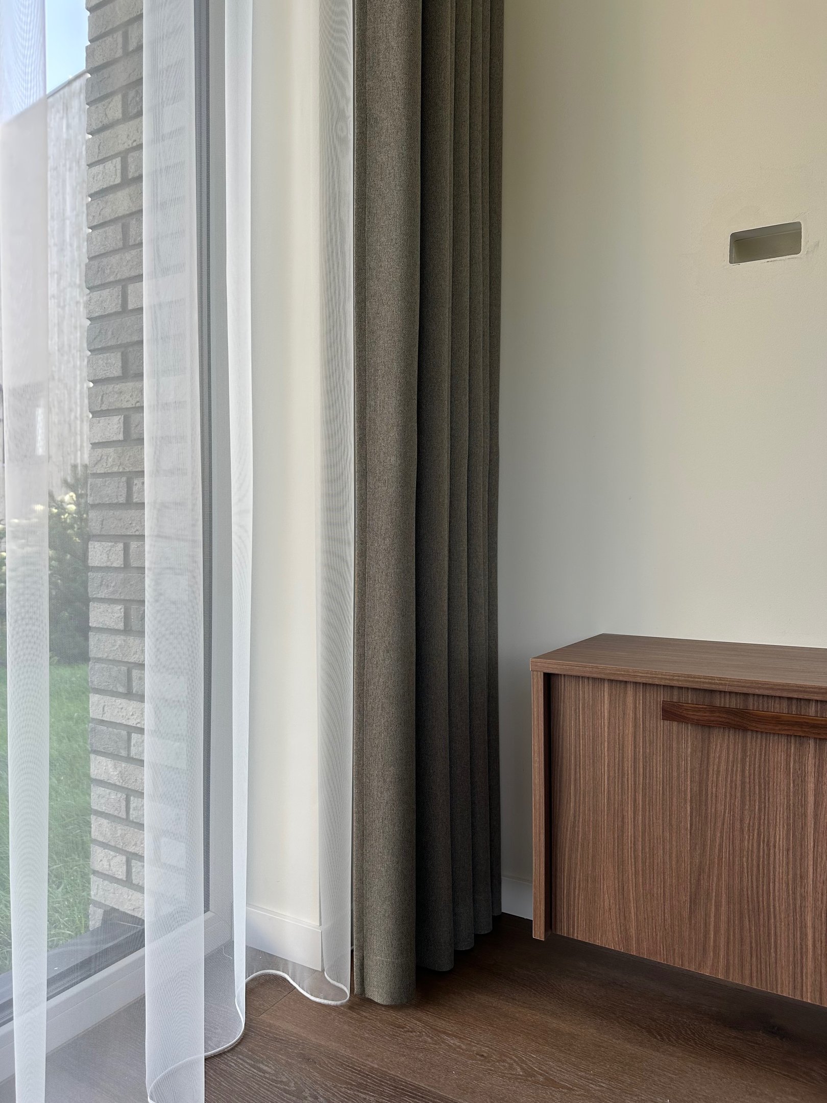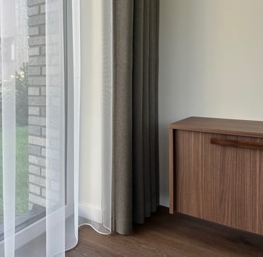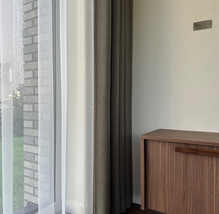 Miegamuosiuose dažniausiai rekomenduojame užtamsinančius (blackout) arba pritemdančius (dimout) audinius, ypač jei langai nukreipti į rytus ar pietus – taip sukuriamas komfortiškas poilsio mikroklimatas.